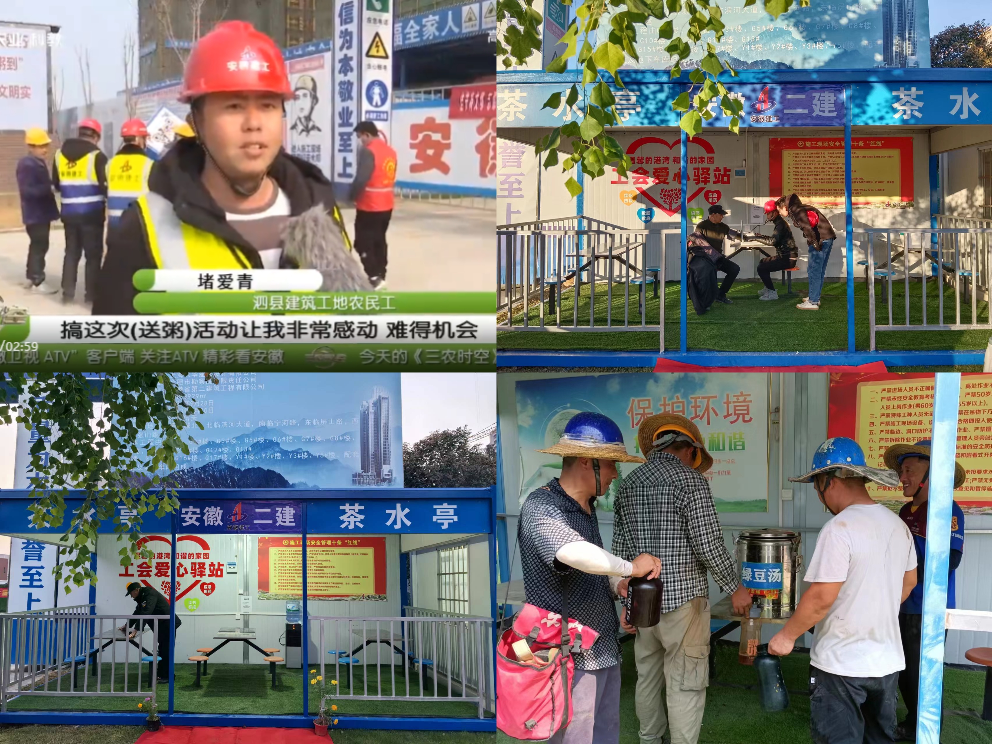 泗縣多金城項目“工會驛站”建設面積約40平方米,自開工以來,為方便一線工友就餐、休息,設立了茶水亭、休息室等“工會驛站”,并配備了純凈水、防暑降溫和外傷應急藥品、血壓測量儀、充電設施、免費WiFi、閱讀室等。通過定期組織免費體檢、防暑降溫藥品和飲品發放、“臘八節”送粥等公益服務活動,為一線員工提供了一個溫馨的休憩港灣。