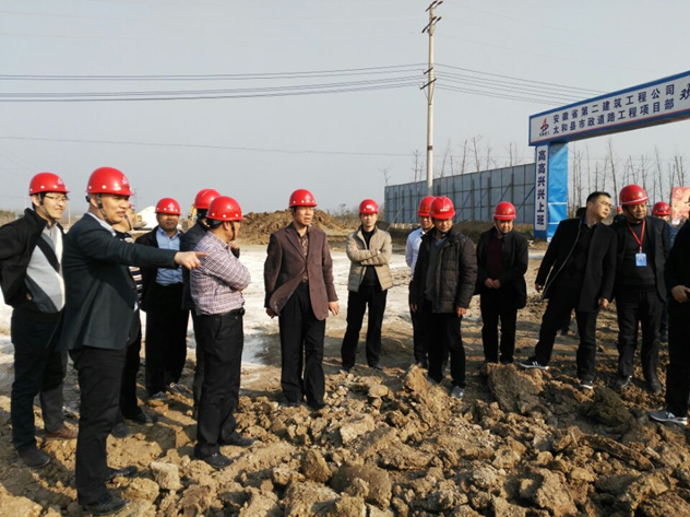 2017年2月15日,集團(tuán)公司黨委委員、副總經(jīng)理王厚良、總經(jīng)理助理、工程管理部主任童宗勝、安全監(jiān)察局主任殷博、投資公司總經(jīng)理朱忠明等一行赴安徽二建承建的太和縣經(jīng)開(kāi)區(qū)現(xiàn)代醫(yī)藥產(chǎn)業(yè)及發(fā)藝產(chǎn)業(yè)基礎(chǔ)配套工程PPP項(xiàng)目工程施工現(xiàn)場(chǎng)檢查指導(dǎo)工作。