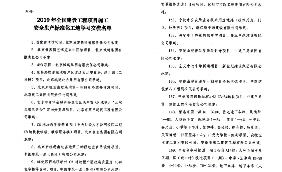 當日下午,分公司收到《關于發布2019年全國建設工程項目施工安全生產標準化工地學習交流名單的通知》,阜陽廣元大學城紅街項目出現在名單上,這是2019年二分公司領導班子以及安全科對項目高度重視、嚴格管理的成果,是項目管理人員對創建工作及分公司各項要求的高效執行力的結果。