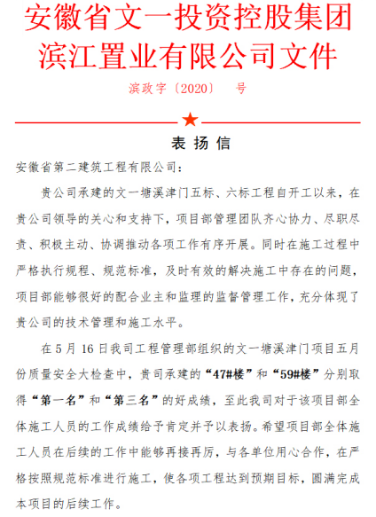 安徽二建文一·塘溪津門五標項目管理團隊堅持疫情防控與復(fù)工復(fù)產(chǎn)兩手抓、兩手硬,管理團隊齊心協(xié)力、盡職盡責(zé)、積極主動,保質(zhì)保量完成施工任務(wù)。在5月16日安徽省文一投資控股集團濱江置業(yè)有限公司工程管理部組織的五月份質(zhì)量安全大檢查中,“47#樓”取得第一名的好成績,獲建設(shè)單位通報表揚。