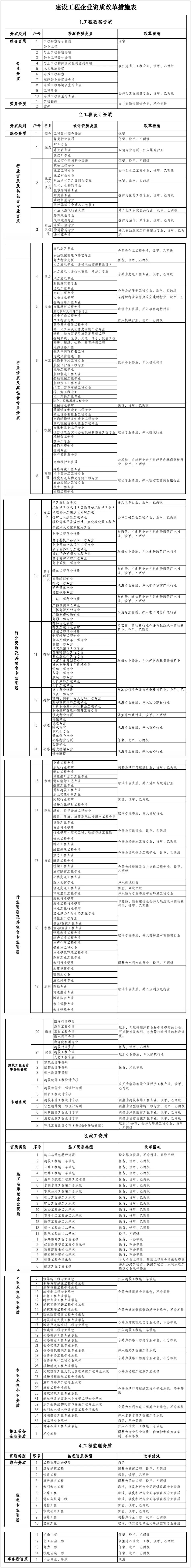 (二)工程設(shè)計(jì)資質(zhì)。保留綜合資質(zhì)。對部分行業(yè)資質(zhì)進(jìn)行整合,其中,冶金行業(yè)與建材行業(yè)合并為冶金建材行業(yè)資質(zhì),輕紡行業(yè)、農(nóng)林行業(yè)、商物糧行業(yè)合并為輕紡農(nóng)林商物糧行業(yè),電子行業(yè)、通信行業(yè)、廣電行業(yè)合并為電子通信廣電行業(yè),石油天然氣行業(yè)并入化工石化醫(yī)藥行業(yè),軍工行業(yè)并入機(jī)械行業(yè),核工業(yè)行業(yè)并入電力行業(yè),資質(zhì)等級(jí)壓減為甲、乙兩級(jí),原丙級(jí)資質(zhì)并入相應(yīng)行業(yè)乙級(jí)資質(zhì)。取消海洋行業(yè)及專業(yè)資質(zhì),相關(guān)企業(yè)可以換發(fā)相近行業(yè)資質(zhì)。整合原化工石化醫(yī)藥、石油天然氣、電力、市政行業(yè)中的專業(yè)資質(zhì),資質(zhì)等級(jí)壓減為甲、乙兩級(jí),原丙級(jí)資質(zhì)并入相應(yīng)專業(yè)乙級(jí)資質(zhì);取消其他行業(yè)的專業(yè)資質(zhì),并入相應(yīng)行業(yè)資質(zhì),原甲、乙級(jí)專業(yè)資質(zhì)并入相應(yīng)等級(jí)的行業(yè)資質(zhì),原丙級(jí)專業(yè)資質(zhì)并入乙級(jí)行業(yè)資質(zhì)。將專項(xiàng)資質(zhì)調(diào)整為通用專業(yè)資質(zhì),取消環(huán)境工程專項(xiàng)資質(zhì)的5個(gè)專項(xiàng)類別,整合為環(huán)境工程專業(yè)資質(zhì),資質(zhì)等級(jí)壓減為甲、乙兩級(jí),原丙級(jí)資質(zhì)并入相應(yīng)專業(yè)乙級(jí)資質(zhì)。保留3類事務(wù)所資質(zhì)。
