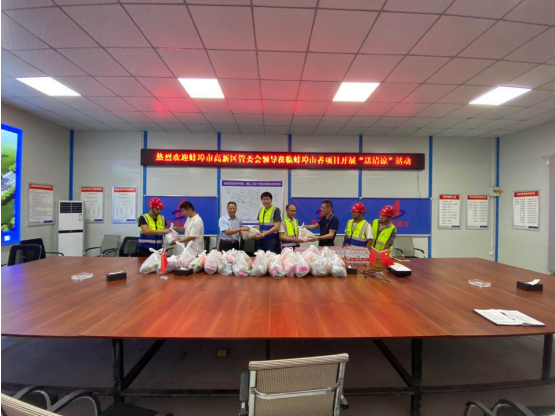 8月11日下午,蚌埠市高新區管委會韓永林,高新投資集團、高新建發公司總經理陳輝蒞臨安徽二建蚌埠山香安置房EPC項目開展“送清涼”活動,為項目送來了藿香正氣水、綠豆、菊花茶、花露水等防暑降溫物品。韓永林詢問了生產進度、質量安全施工以及高溫天氣項目部采取的防暑降溫措施等方面情況,同時要求,一定要確保高溫天氣下現場作業人員的安全,切實提高對一線作業職工的關心、關懷,避免 “非戰斗減員”情況發生,把安全放在首位,做到安全文明施工。