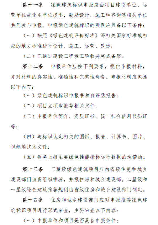 《辦法》規定,住房和城鄉建設部負責制定完善綠色建筑標識制度,指導監督地方綠色建筑標識工作,認定三星級綠色建筑并授予標識。省級住房和城鄉建設部門負責本地區綠色建筑標識工作,認定二星級綠色建筑并授予標識,組織地市級住房和城鄉建設部門開展本地區一星級綠色建筑認定和標識授予工作。