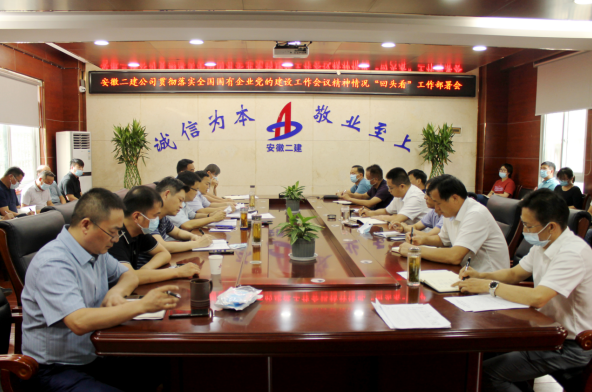 9月3日下午,安徽二建公司召開貫徹落實全國國有企業(yè)黨的建設(shè)工作會議精神情況“回頭看”工作部署會,學習傳達了建工控股黨委貫徹落實全國國有企業(yè)黨的建設(shè)工作會議精神情況“回頭看”工作部署會暨三季度黨群工作會議精神,并對公司開展“回頭看”工作進行部署安排。公司黨委副書記、總經(jīng)理李建成作動員講話,公司黨委副書記、工會主席王軍主持會議。公司領(lǐng)導班子成員、機關(guān)部門主要負責人、所屬各單位黨政主要領(lǐng)導參會。