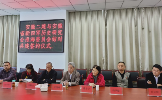 2020年10月26日下午,安徽省新四軍歷史研究會淮海委員會會長張振山,副會長徐寧寧、彭小萍、張華明、楊承愉、李茂輝以及秘書長高立共7人蒞臨安徽二建四分公司開展結對共建簽約儀式。