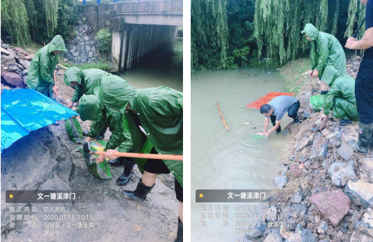 一分公司文一·塘溪津門項目全體人員積極響應公司及建設單位的號召,立即展開了一系列的抗洪搶險工作。針對D-09-04地塊金斗公園內(nèi)部河道漫水至工地影響現(xiàn)場安全的情況,及時在河道漫水區(qū)域堆放沙袋,封堵漫水口,保河堤戰(zhàn)洪水,抗洪搶險奮戰(zhàn)一線。