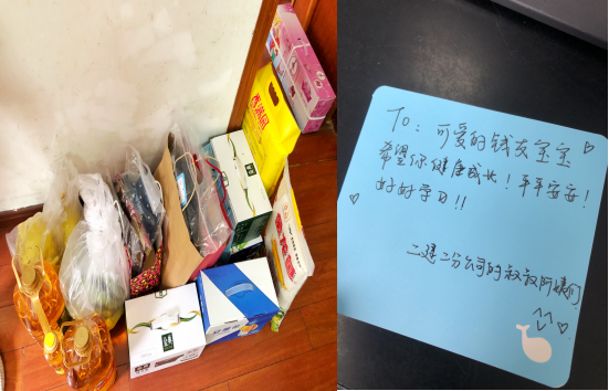 時隔三年,二分公司工會心系祖孫二人的生活狀況,了解到目前他們已被我公司職工接來合肥,老人租房帶著孫子在省二建幼兒園上學。志愿服務隊了解到具體需求后,即刻在分公司范圍內組織了捐款和捐贈物資的扶貧幫困志愿服務活動,二分公司職工積極響應,踴躍捐贈,短短幾天時間募得慰問金4100元以及米面糧油、牛奶酸奶、水果、兒童圖書、玩具、老人及孩子的衣物鞋子等生活物品。2020年5月29日上午,二分公司工會主席黃業云帶領三支志愿服務隊代表前往老人家里看望老人及孩子。服務隊將大家捐獻的慰問金和生活物品一并交給了他們,希望能讓他們的生活過得好一點,能夠感受到二建大家庭的溫暖。交談中,老人質樸的臉頰上始終帶著微笑,身旁的孫子也是乖巧懂事,非常有禮貌,一直開心地說著“謝謝叔叔阿姨!”