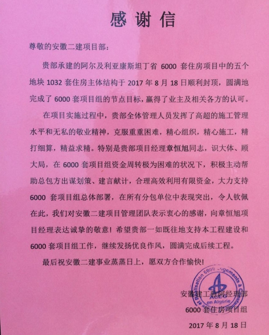 康斯坦丁6000套工程項目是由安徽建工集團獨立總承包的項目,安徽二建公司承擔1032套施工任務(wù),建筑面積10萬平米,合同額2.5億人民幣,此次結(jié)構(gòu)封頂?shù)氖瞧渲形鍌€地塊1032套住房。項目部在施工過程中,克服重重困難,科學制定施工方案,合理調(diào)配人員設(shè)備,精心組織,精細施工,抓管控保優(yōu)質(zhì),始終秉持“建精品、創(chuàng)一流”的建設(shè)目標,將工程質(zhì)量放在第一位。在項目部全體參建員工的努力下,康斯坦丁6000套項目的建設(shè)獲得了業(yè)主及相關(guān)各方的好評。安徽建工駐阿經(jīng)理部6000套項目組在感謝信中充分肯定了項目部的建設(shè)成果,高度贊揚安徽二建項目部高效的管理水平和無私的敬業(yè)精神,并特別對安徽二建項目經(jīng)理章恒旭同志識大體、顧大局的工作作風以及積極主動、建言獻策的工作態(tài)度表示感謝。在信的結(jié)尾,6000套項目組對今后的合作也提出了期許,希望能夠攜手并進,共創(chuàng)未來。