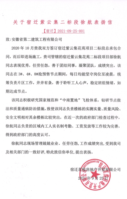 近日,第三分公司宿遷中南紫云集花苑項(xiàng)目的施工員徐航收到了一封業(yè)主單位發(fā)來的表揚(yáng)信,平日大方灑脫的他在收到信后露出了靦腆的笑容,他表示:“這是自己的分內(nèi)工作,以后會(huì)繼續(xù)保持”。平日里的徐航工作責(zé)任心強(qiáng),在項(xiàng)目3#、4#、8#搶收節(jié)點(diǎn)期間,兢兢業(yè)業(yè)堅(jiān)守崗位,每日加班加點(diǎn)至凌晨,在他和所在片區(qū)工人的努力下,項(xiàng)目如期完成節(jié)點(diǎn)任務(wù)。針對(duì)項(xiàng)目現(xiàn)場(chǎng)工作總是親歷親為,在面對(duì)裝配式項(xiàng)目的施工難點(diǎn)、重點(diǎn)工作時(shí),通過對(duì)專業(yè)書籍的學(xué)習(xí),不斷攻堅(jiān)克難,提高能力,增強(qiáng)技能。他負(fù)責(zé)的片區(qū)在質(zhì)量風(fēng)險(xiǎn)、勞務(wù)實(shí)名制等方面工作明顯優(yōu)于其他樓棟的工作,在業(yè)主方“飛檢”、政府檢查中得到高度認(rèn)可。