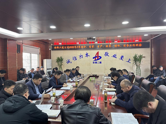 春潮涌動,新意盎然。3 月7日下午,安徽二建公司在一樓會議室召開了2022年3月安全、質(zhì)量、生產(chǎn)、決算、債權(quán)、法務(wù)工作例會。公司總經(jīng)理李建成、副總經(jīng)理費勤波出席會議,公司相關(guān)部門負責人、所屬各單位經(jīng)理、分管領(lǐng)導(dǎo)及工管、安全科長參加會議,副總經(jīng)理葉和永主持會議。