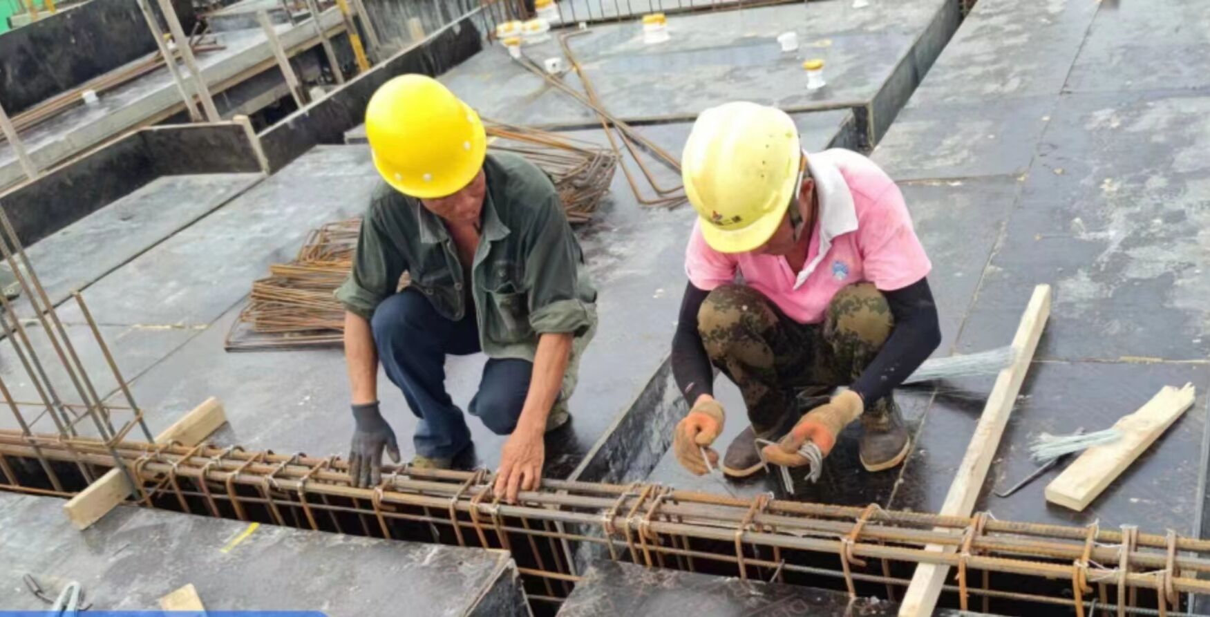 鋼筋工正忙著扎鋼筋,鐵絲在鋼筋間不停的穿插