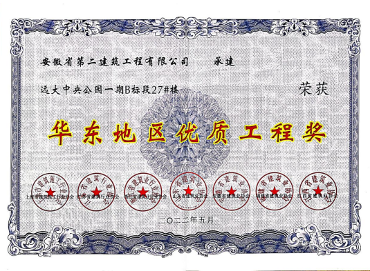 近日,由安徽二建公司承建的“舒城遠大中央公園工程一期B標27#樓”工程被授予了“2021年度‘華東地區優質工程獎’”榮譽稱號。